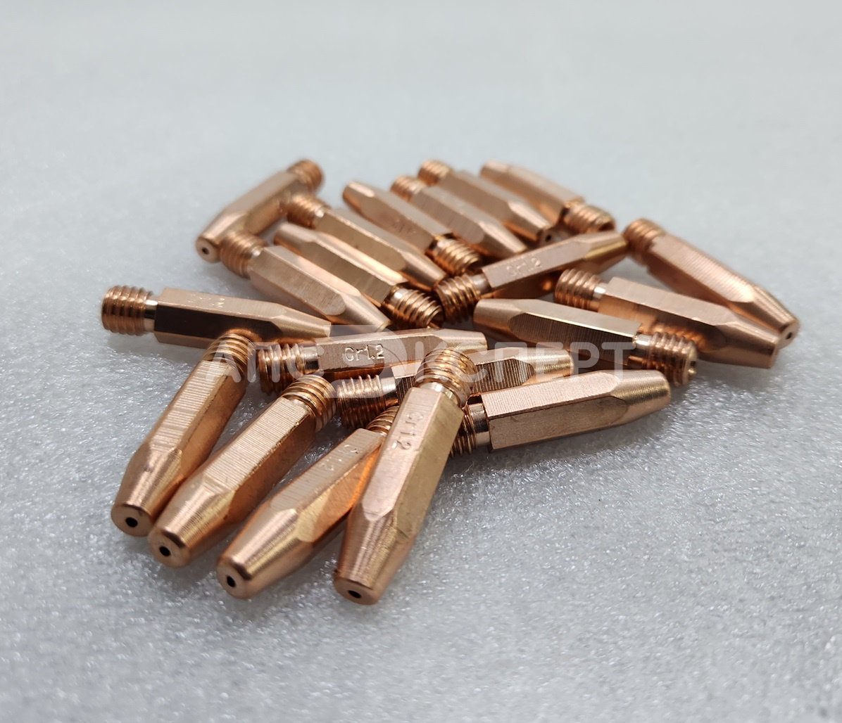 Усиленный контактный наконечник из сплава меди, хрома и циркония (CuCrZr) для полуавтоматической сварки. Предназначен для работы со сплошной и порошковой проволокой диаметром 1.0–1.2 мм. Длина 35 мм и резьба М8×1.0 обеспечивают совместимость с горелками стандарта RF-45 и аналогами.